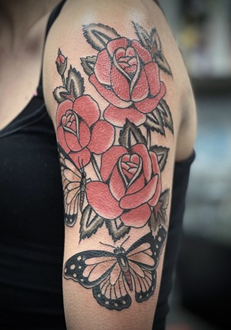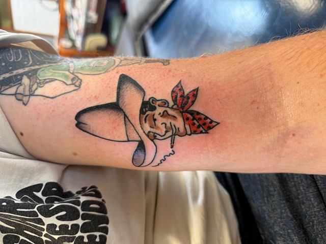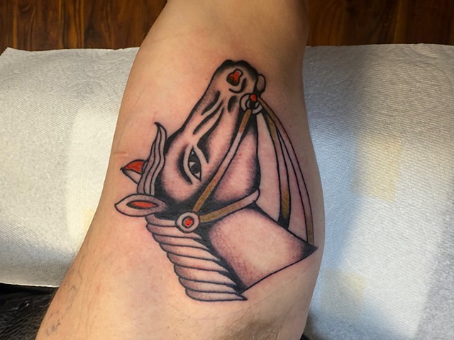 I've always been inspired by designs from the golden age of tattooing a well as folk art from peoples all over the world. I draw inspiration from advertisements, post cards, motel signs, cartoons and the like from the 20th Century.
